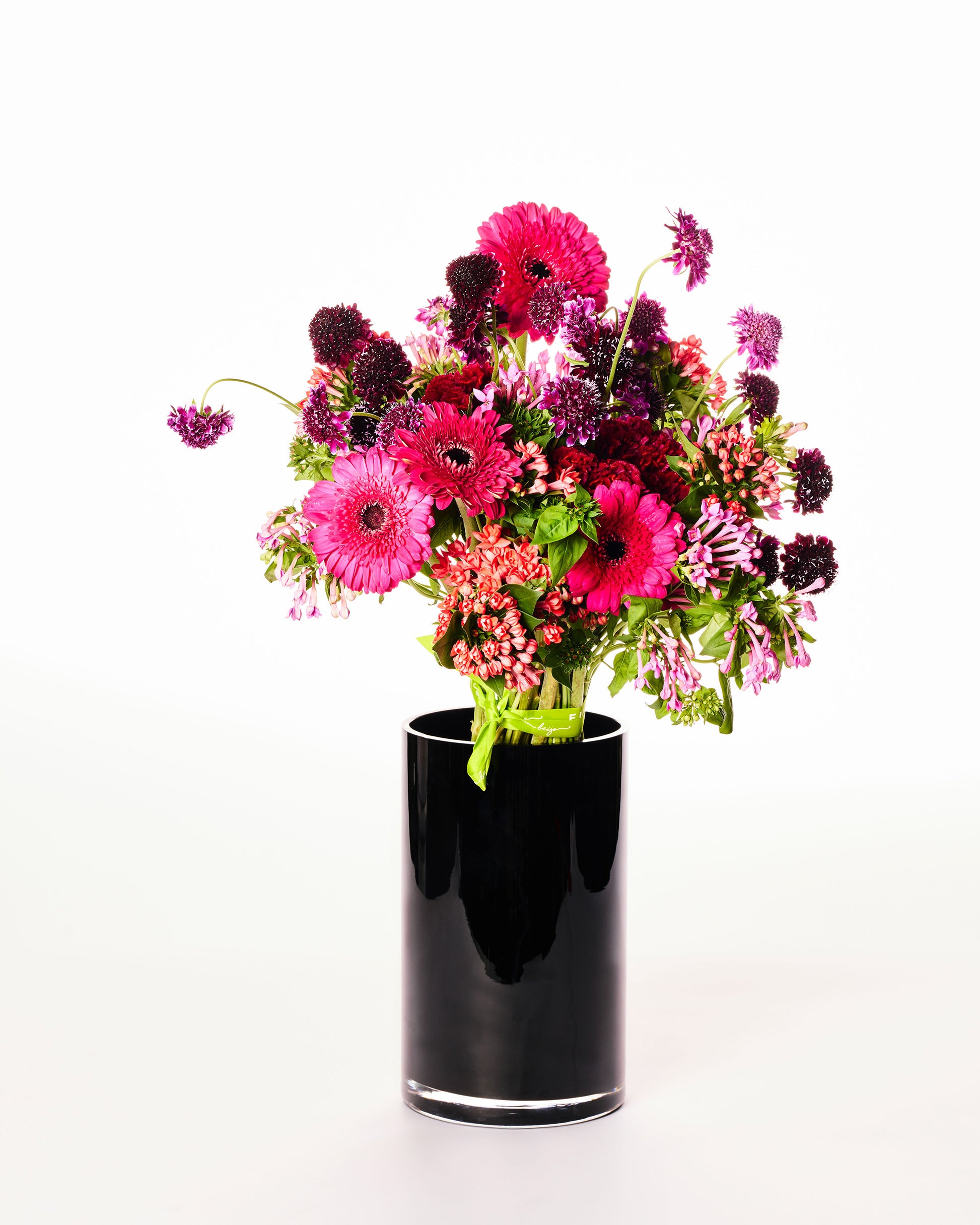 Inspirado nos tons intensos do céu ao amanhecer, este arranjo traz uma explosão de cores vibrantes em um jogo harmonioso de flores rosadas, púrpuras e avermelhadas. Gérberas, escabiosas e angélicas criam uma composição cheia de energia e frescor, perfeita para iluminar qualquer ambiente com a delicadeza e força da primeira luz do dia.