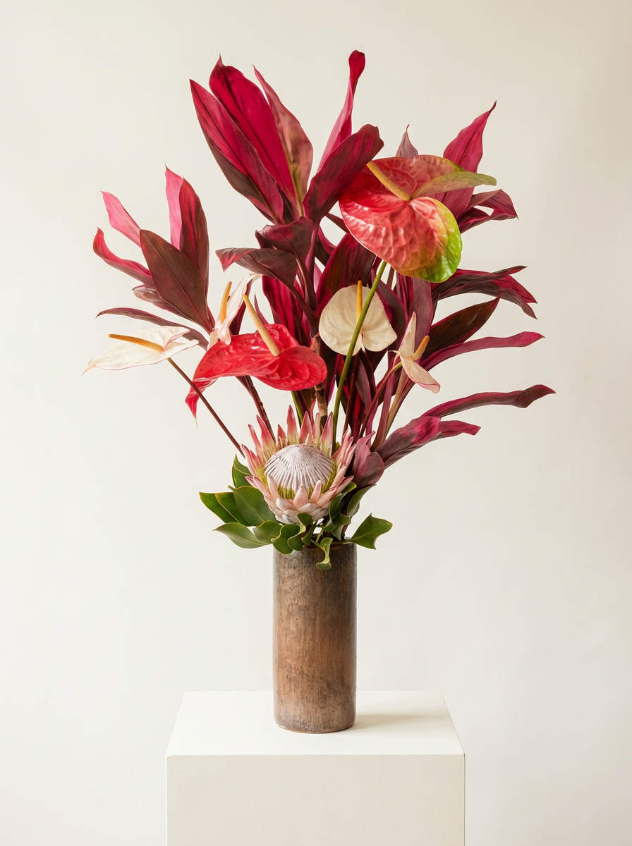 Composição: Antúrios vermelhos e brancos, protea real, folhas de dracena vermelha e folhagens tropicais.