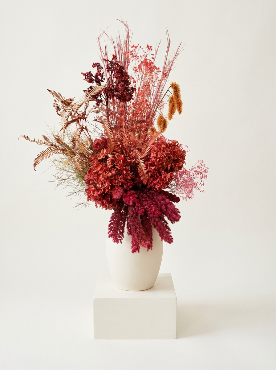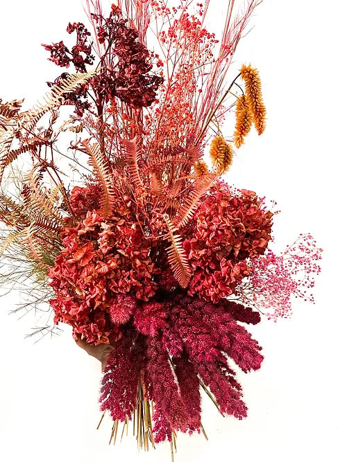Composição: Hortênsias secas, ramos silvestres avermelhados, samambaias tingidas, amarantos e folhagens texturizadas.