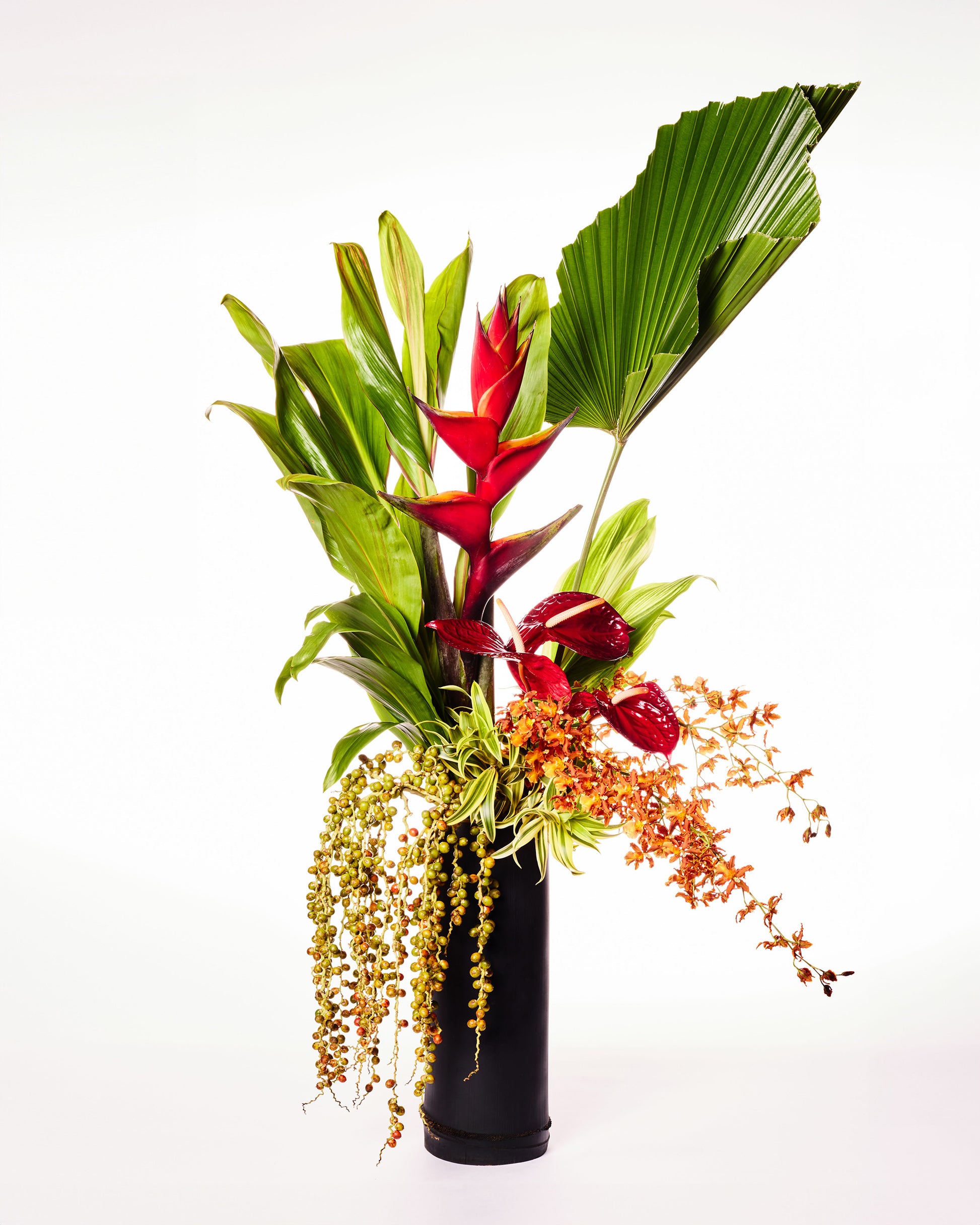 Composição: Helicônias vermelhas, antúrios, orquídeas alaranjadas, folhagens tropicais e sementes pendentes