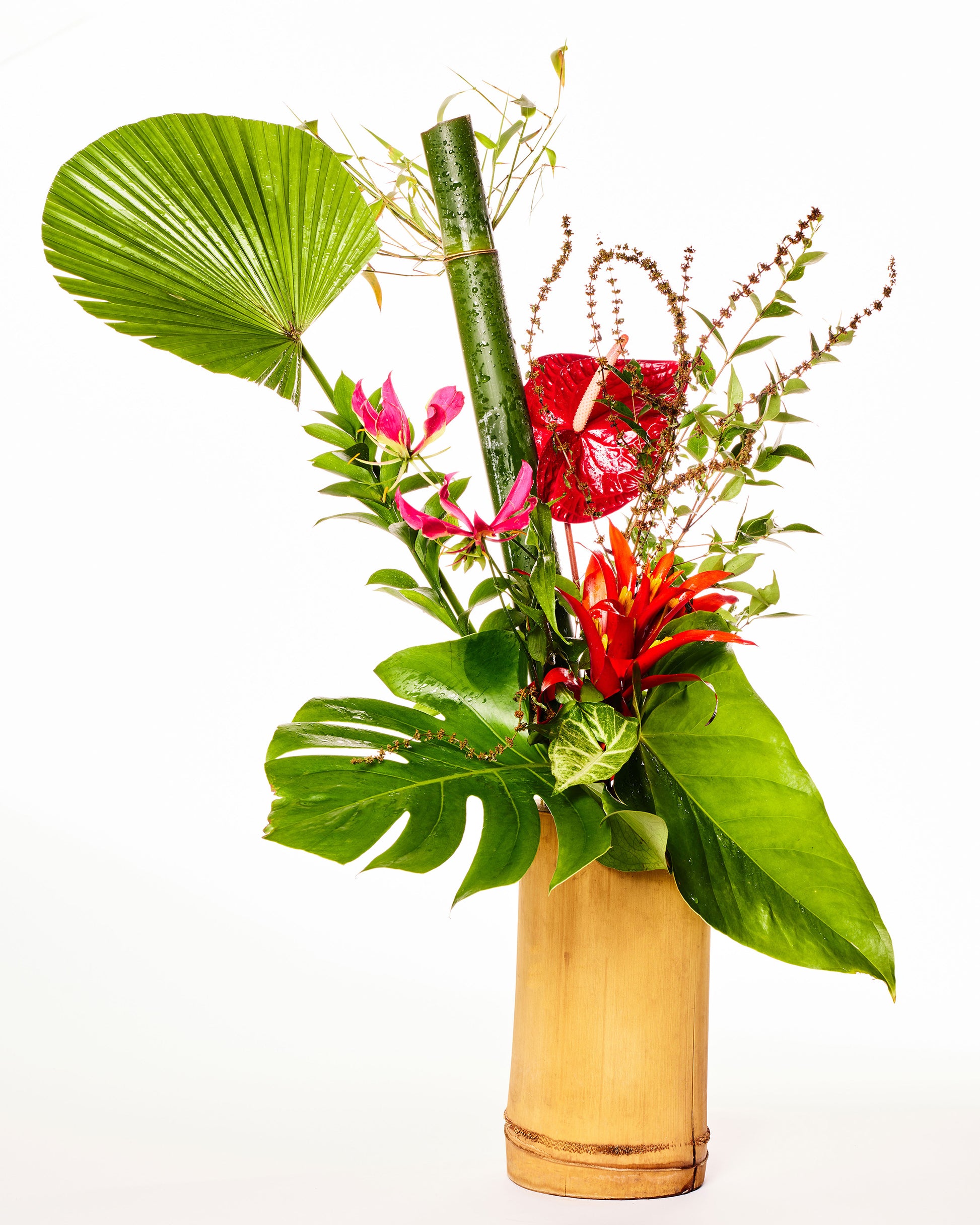 Composição: Antúrio vermelho, gloriosa, bromélia, folhagens tropicais e bambu