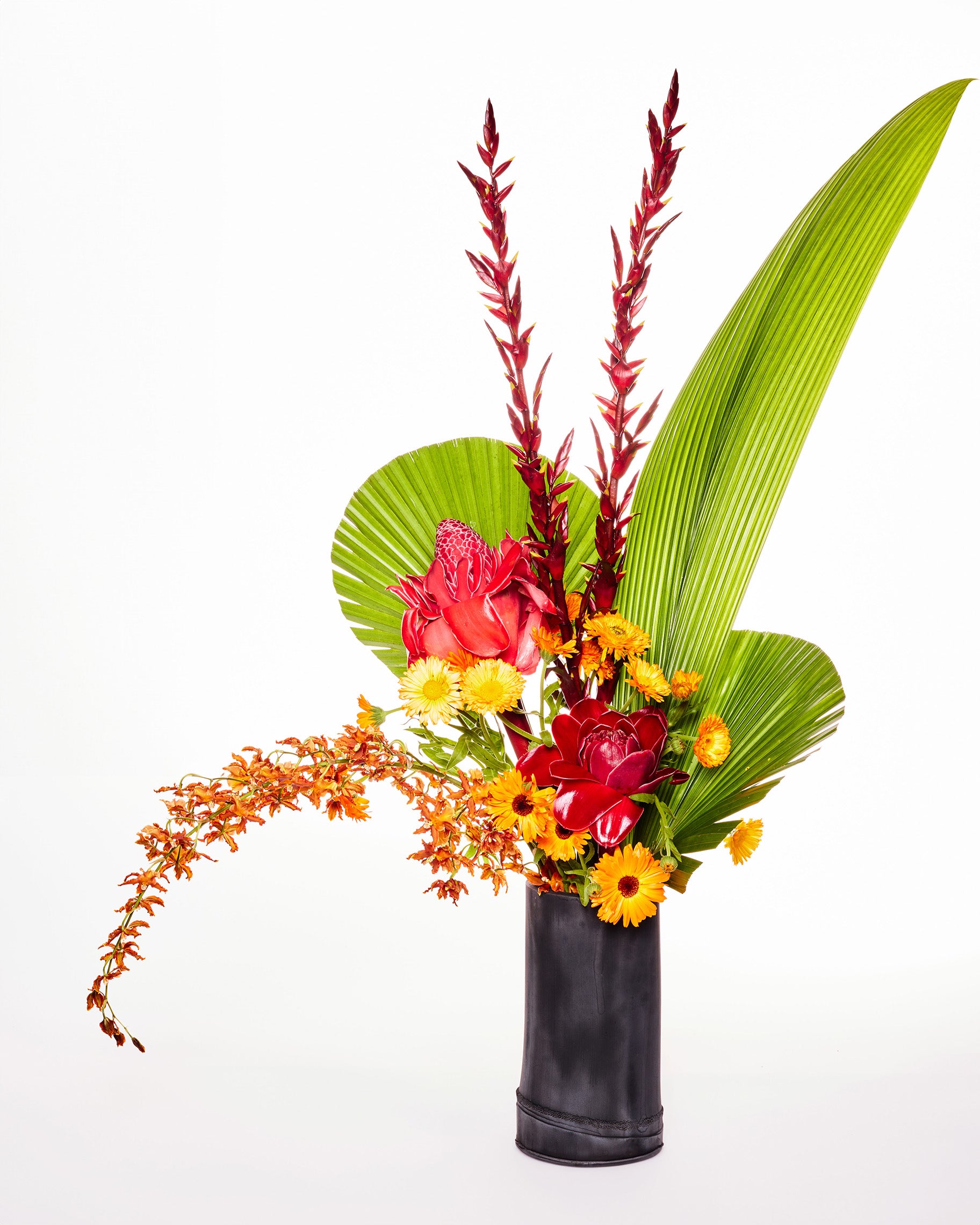 Composição: Bastão-do-imperador, antúrios vermelhos, orquídeas chuva-de-ouro, sempre-vivas amarelas e folhagens tropicais.